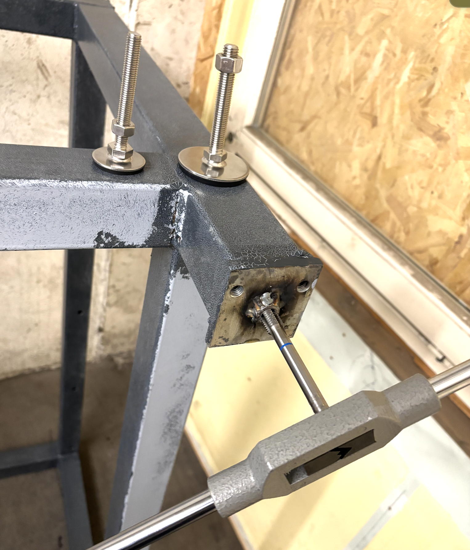 Dazu 10er Löcher in das Gestell bohren, und mit 12er Senker weiten damit genug Spielraum für das Ausrichten des Tisches bleibt und mit großzügig dimensionierten Beilagscheiben unterlegen: