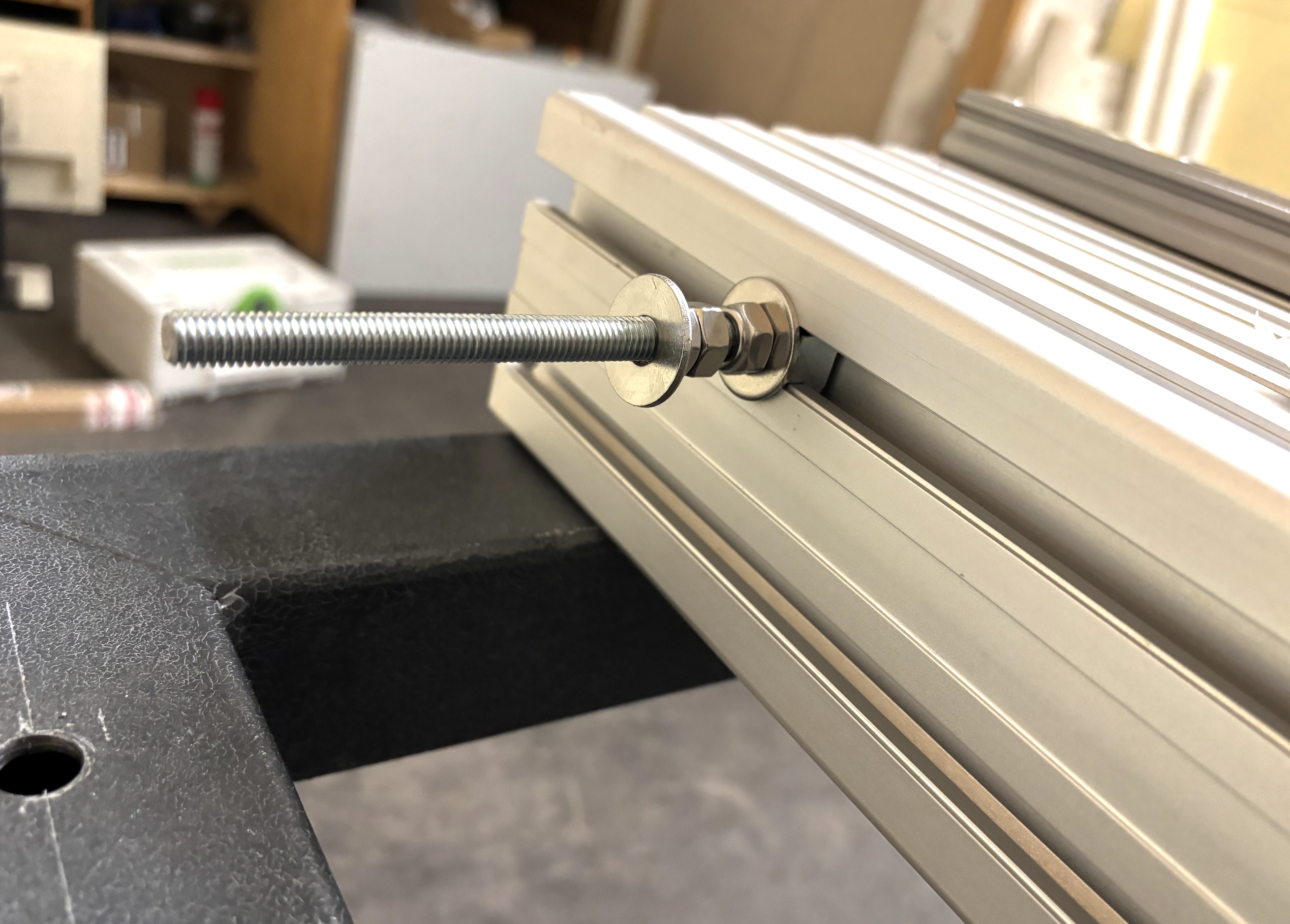 Für die exakte Ausrichtung der Fräse auf dem Untergestell habe ich mich für M8 Nutensteine mit M8 Gewindestangen und einer Konter-Verschraubung am Gestell entschieden: