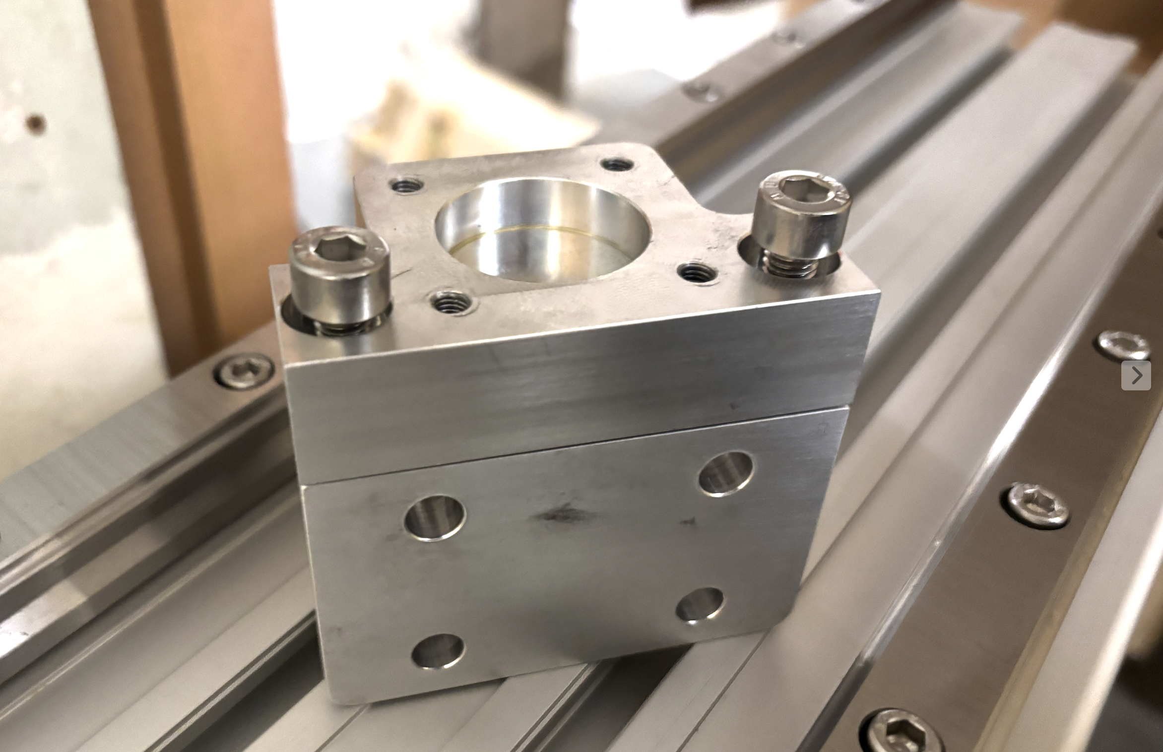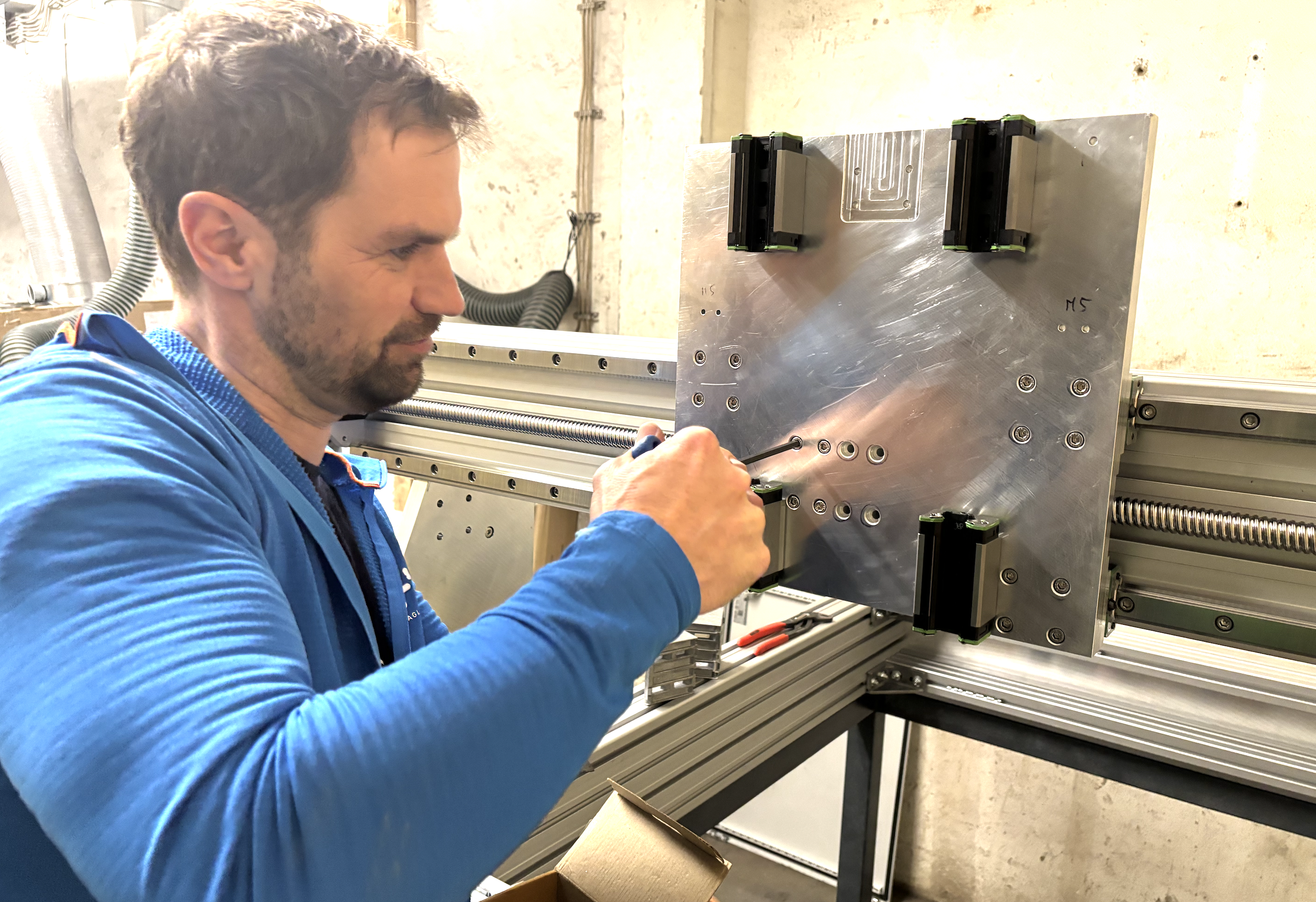 Untere Linearführung wird durch Verschraubung mit Trägerplatte ausgerichtet.