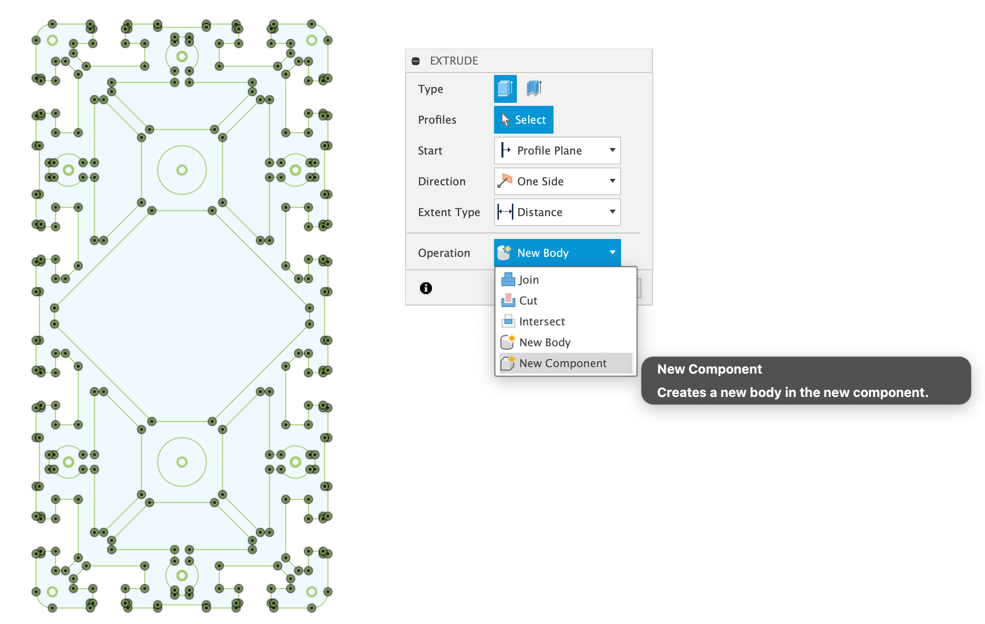 Eextrudiert - dabei ist wichtig, dass bei der Operation "New Component" gewählt wird: