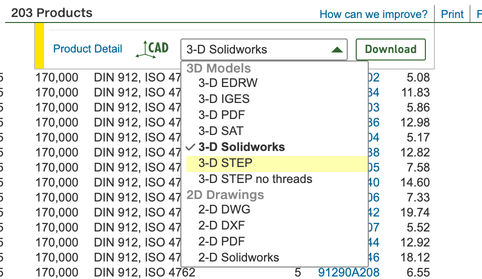 - Wenn ihr das gewünschte Bauteil gefunden habt, ist es wichtig, im Dropdown-Menü zum Download "3-D Step" auszuwählen, danach "Download"